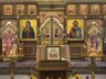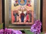 На аналое в центре нашего храма – главная икона сегодняшнего праздника, отражающая важнейшее событие, которое произошло на сороковой день после Пасхи. В центре – образ Богородицы в окружении всех двенадцати апостолов. И Господь, возносящийся в небо вместе с ангелами.