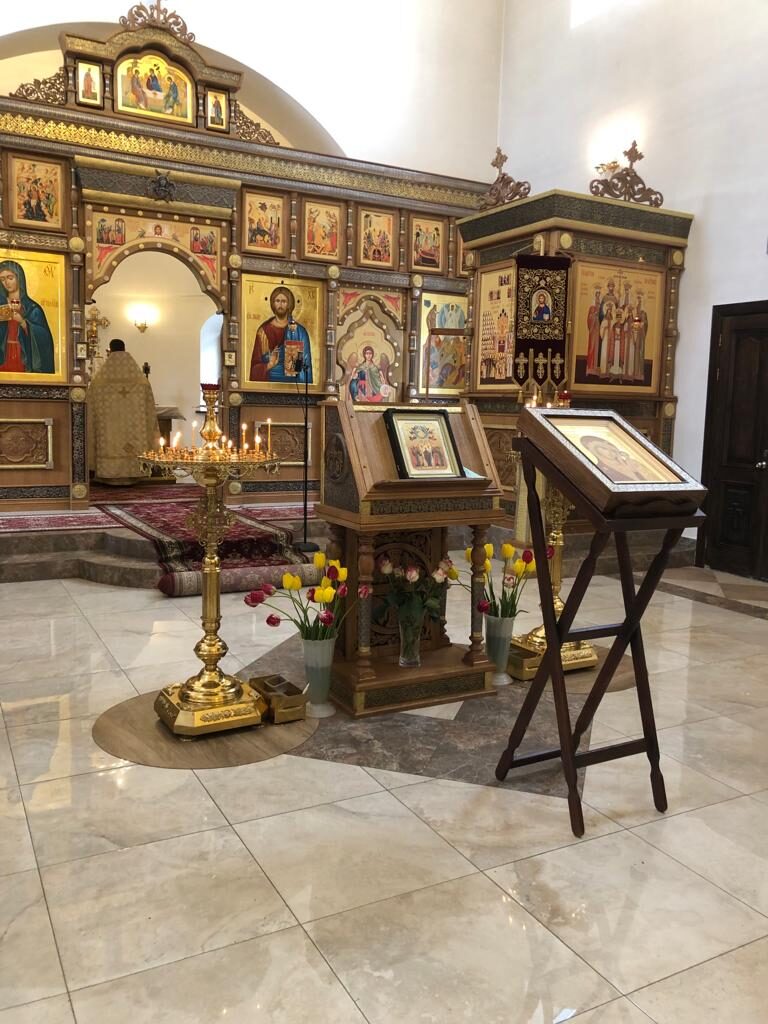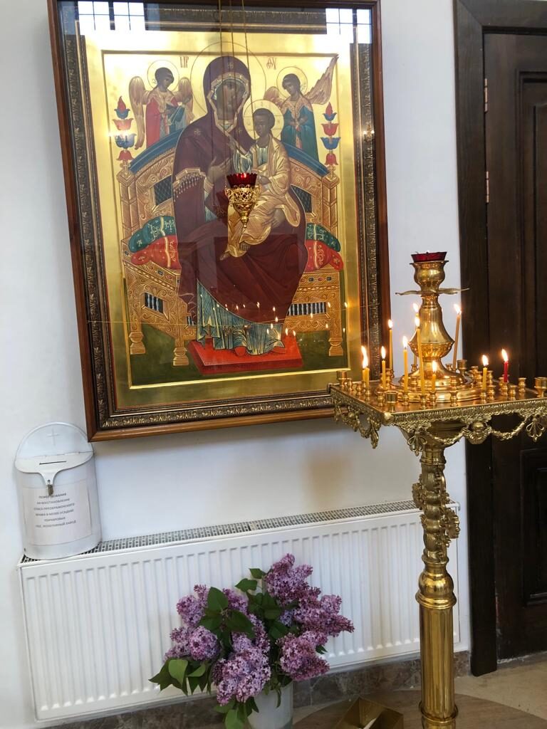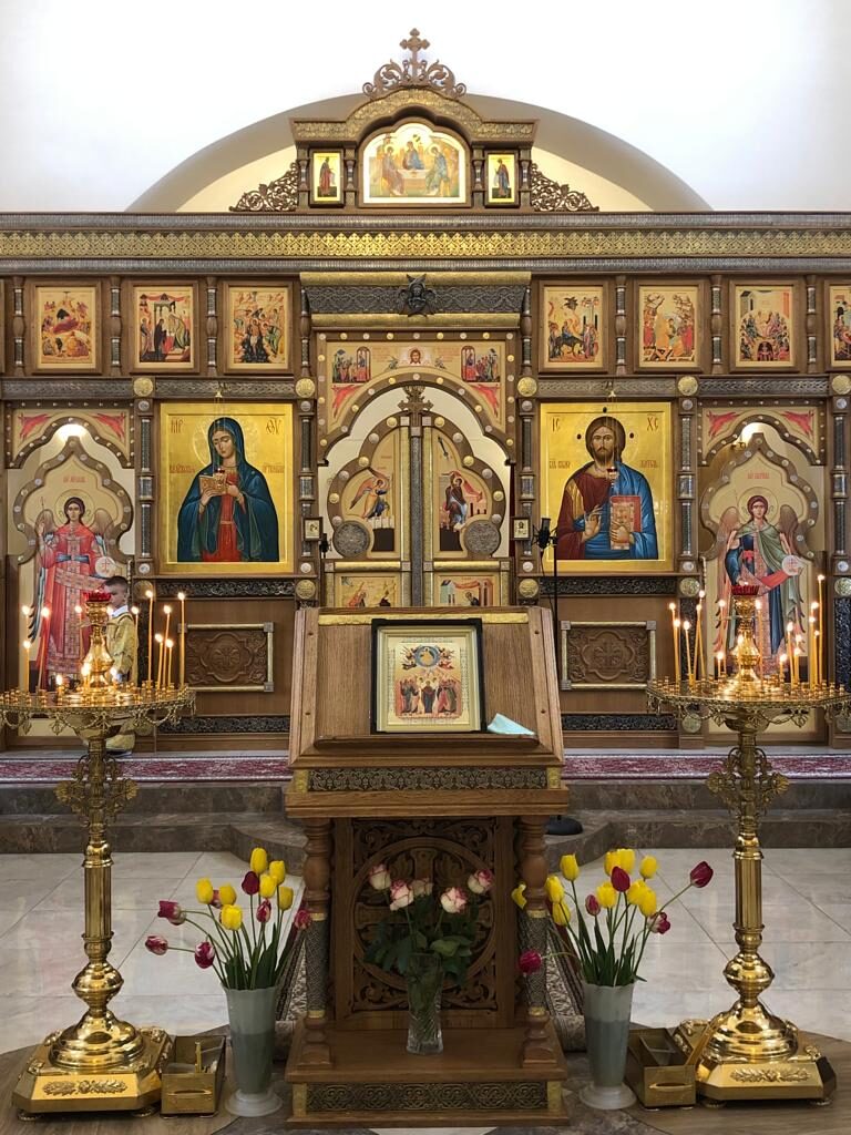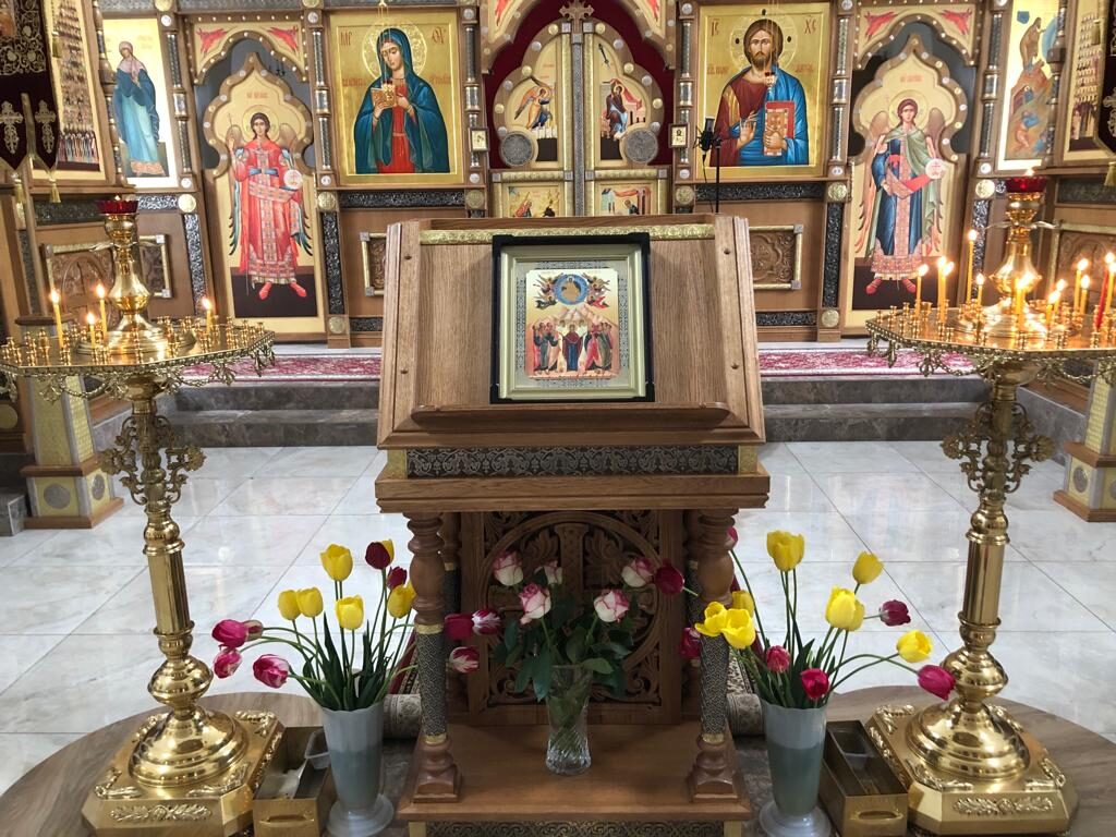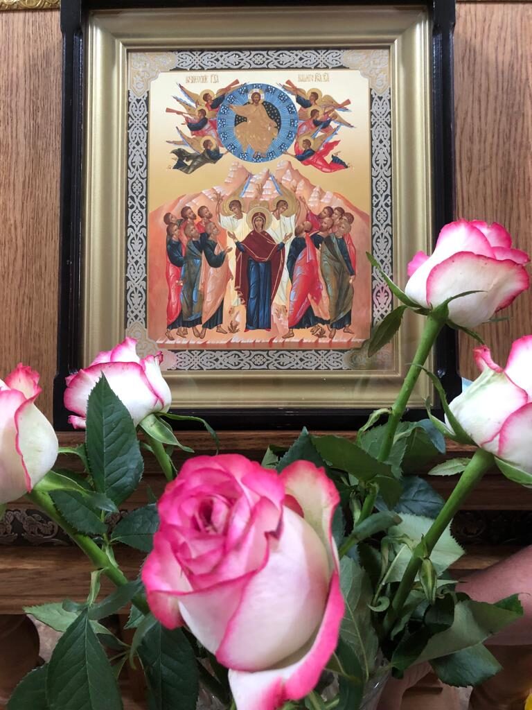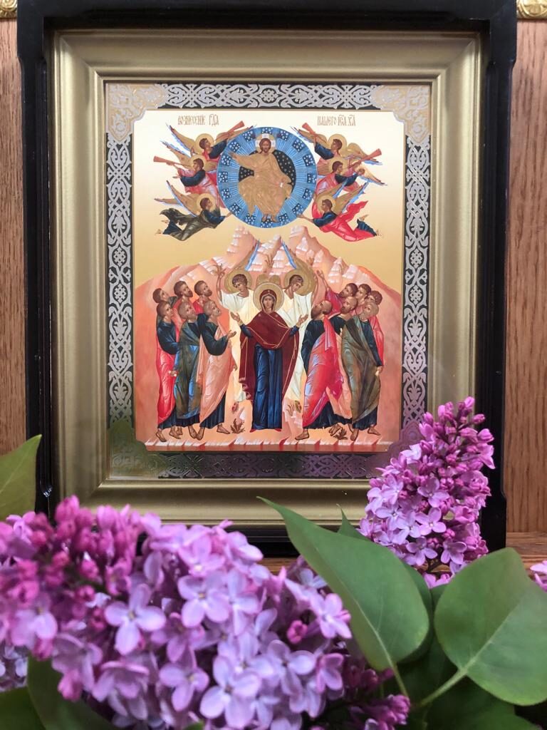 На аналое в центре нашего храма – главная икона сегодняшнего праздника, отражающая важнейшее событие, которое произошло на сороковой день после Пасхи. В центре – образ Богородицы в окружении всех двенадцати апостолов. И Господь, возносящийся в небо вместе с ангелами.