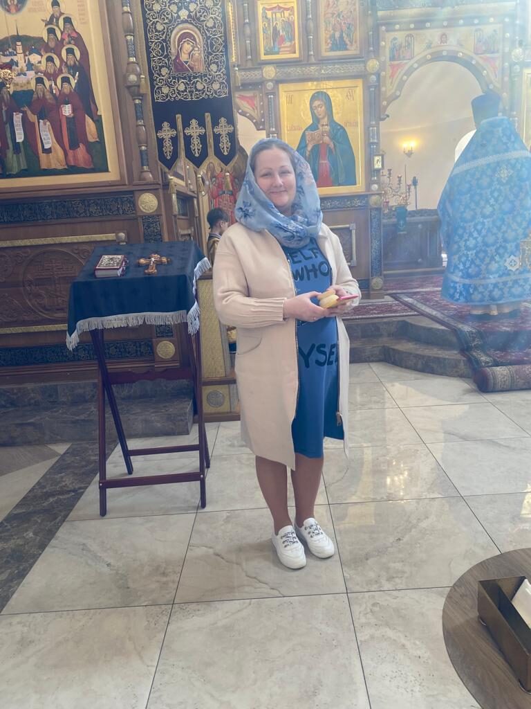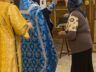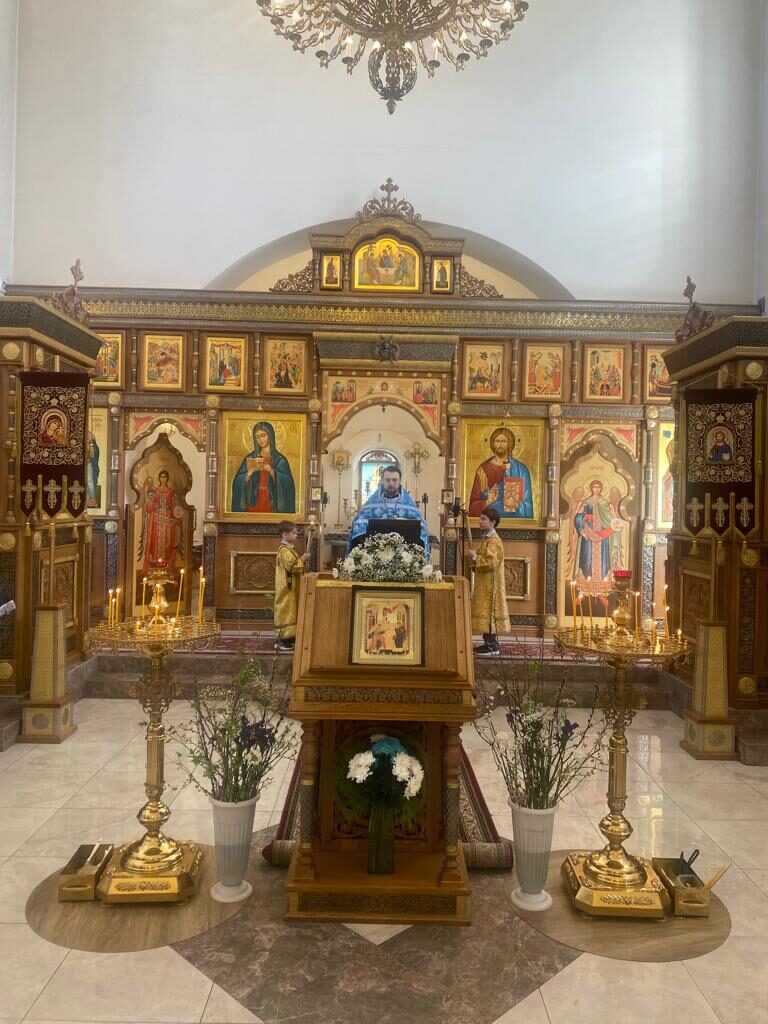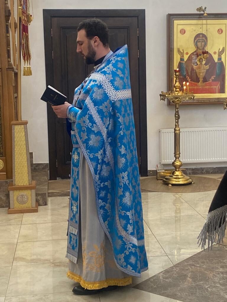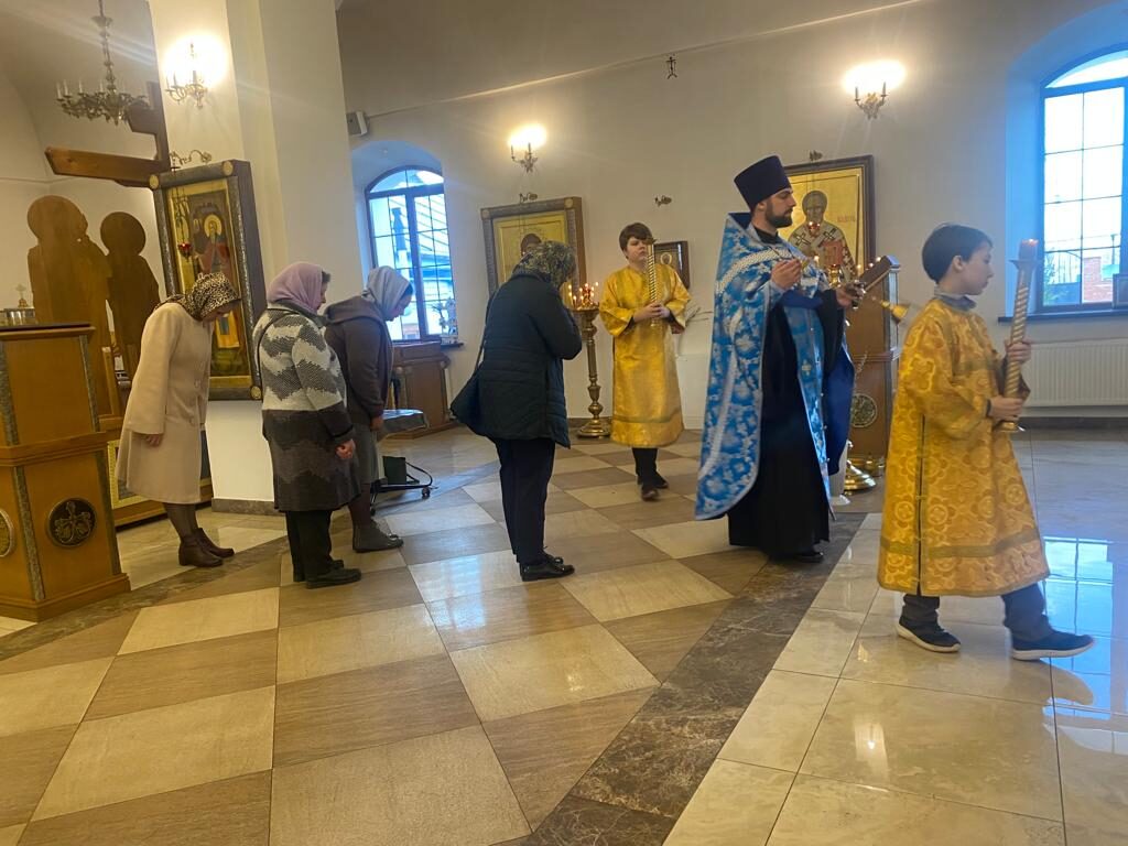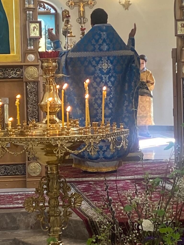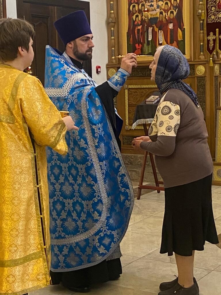 Батюшка Ярослав в праздничном облачении голубого цвета — этот оттенок является символом Богородицы. И наши прихожаночки тоже в праздничных голубых и синих платочках. И от этого в храме стало празднично и нарядно. Большая часть прихожан подготовились к исповеди и Святому Причастию.