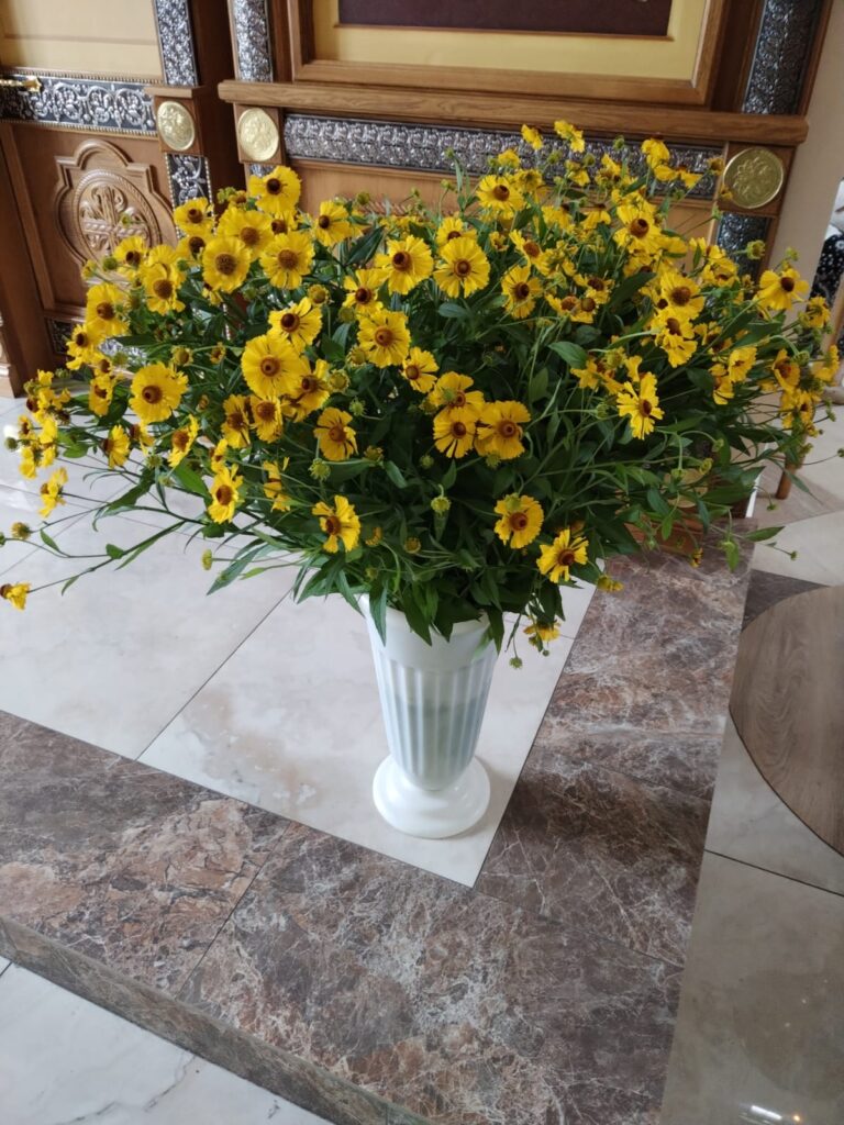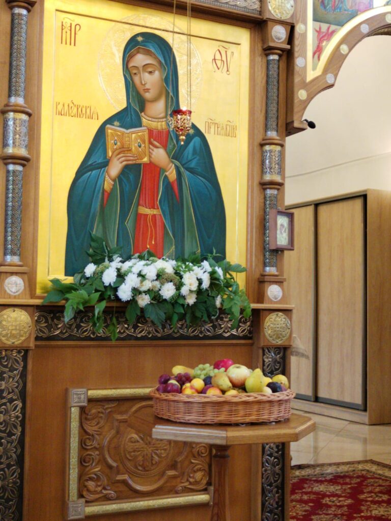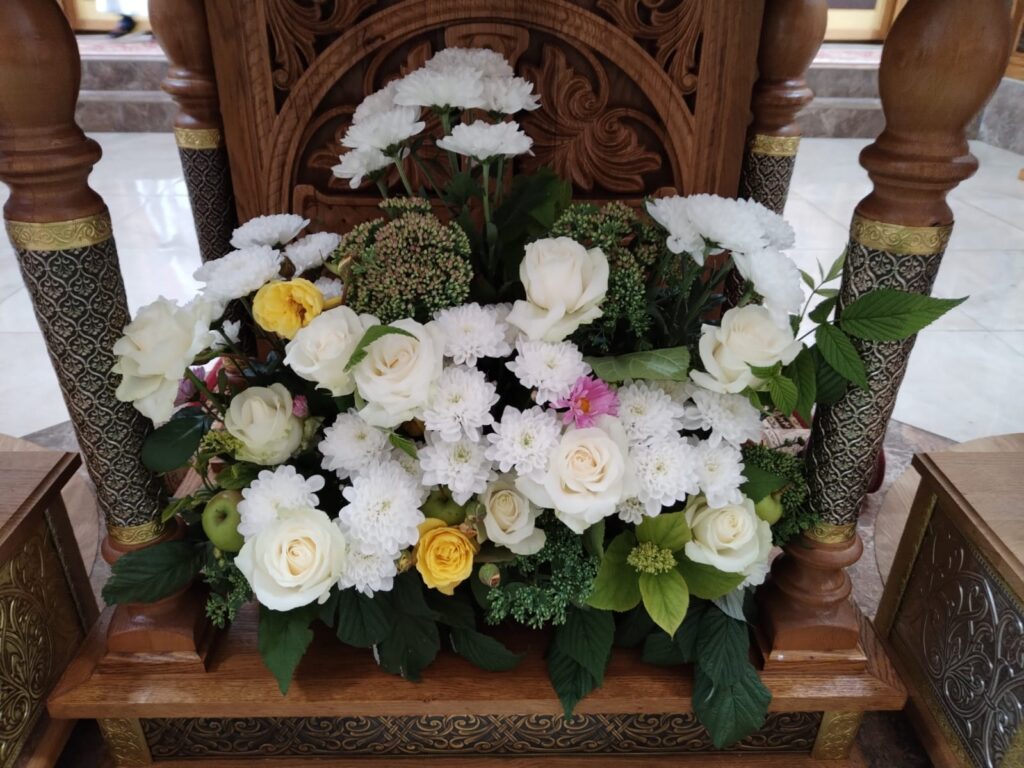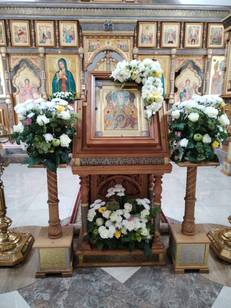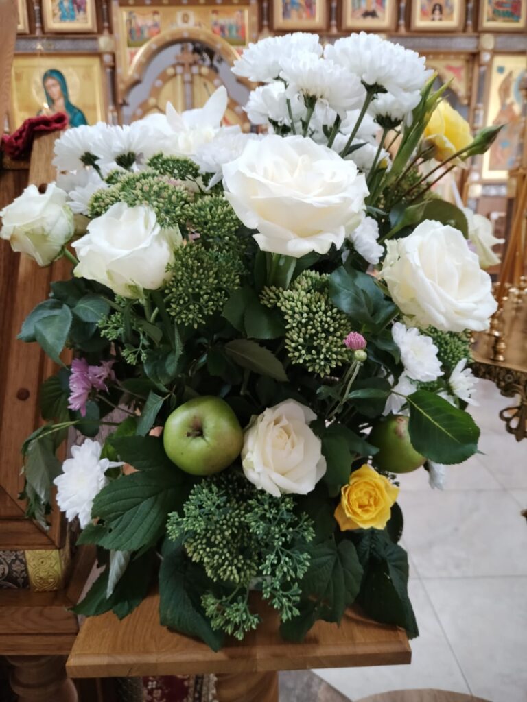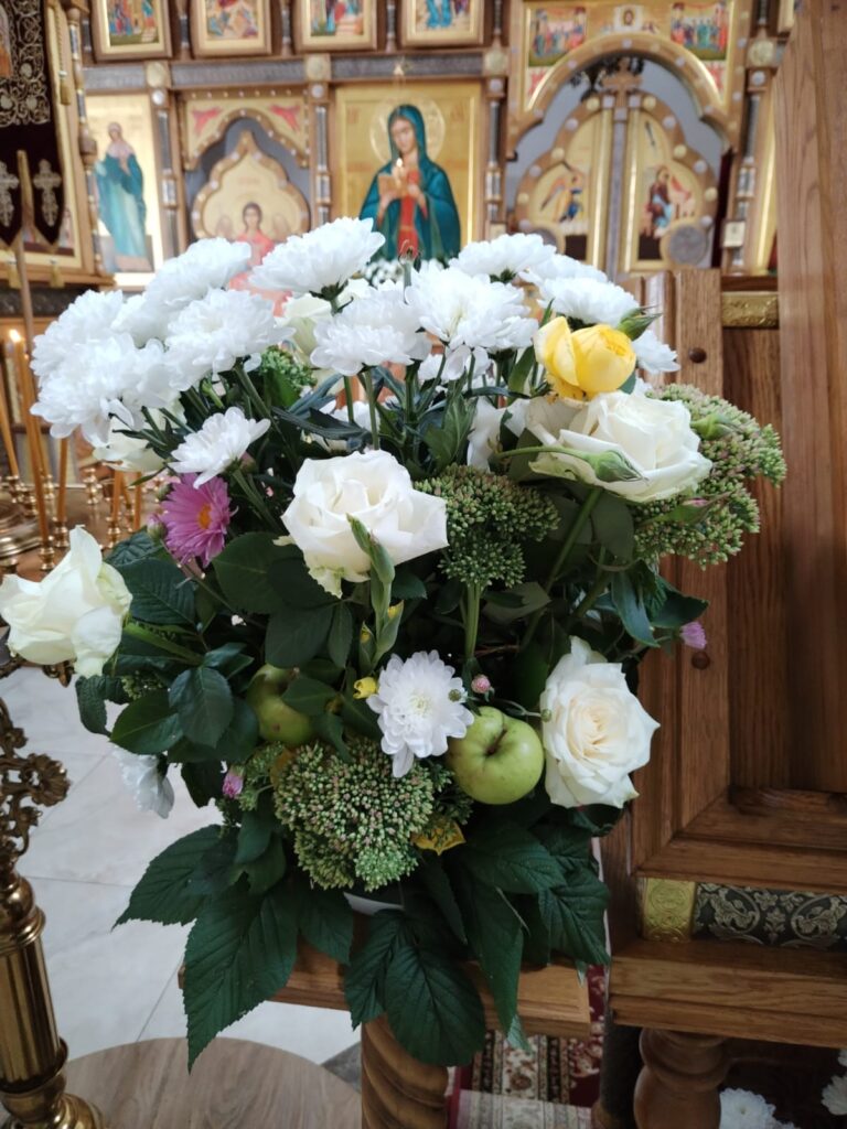 Для нашего храма это престольный праздник. Как преобразился Господь, так преобразился и наш храм, в каждом уголке которого стояли вазы с множеством разных благоухающих цветов. И самая главная икона Преображения Господня была украшена белыми цветами (белый цвет – символ чистоты) и яблоками (праздник Преображения Господня в народе называют Яблочным Спасом).