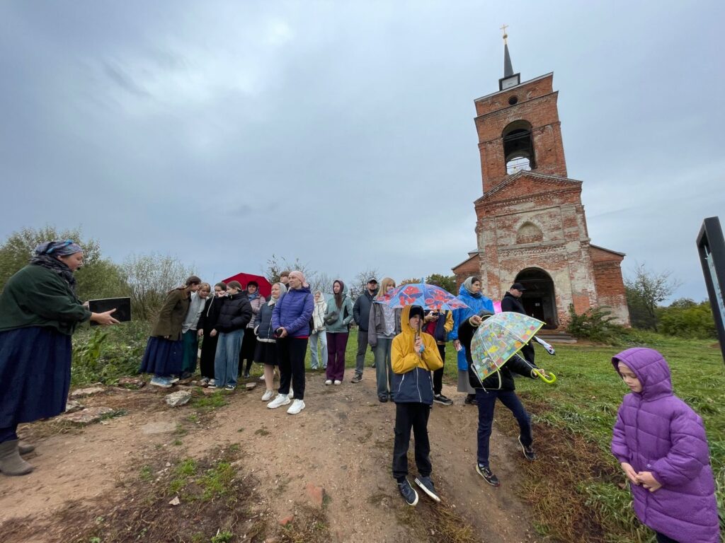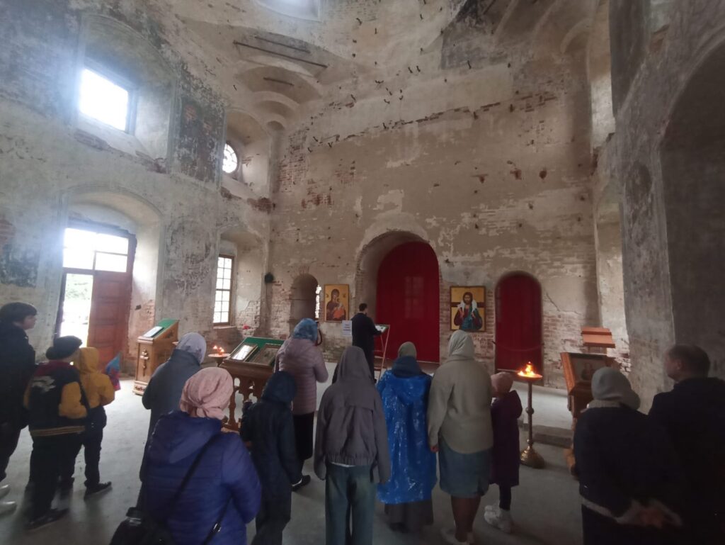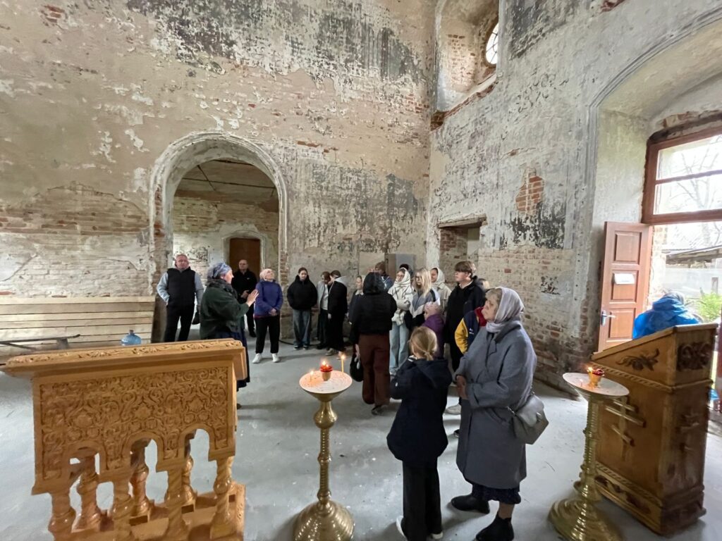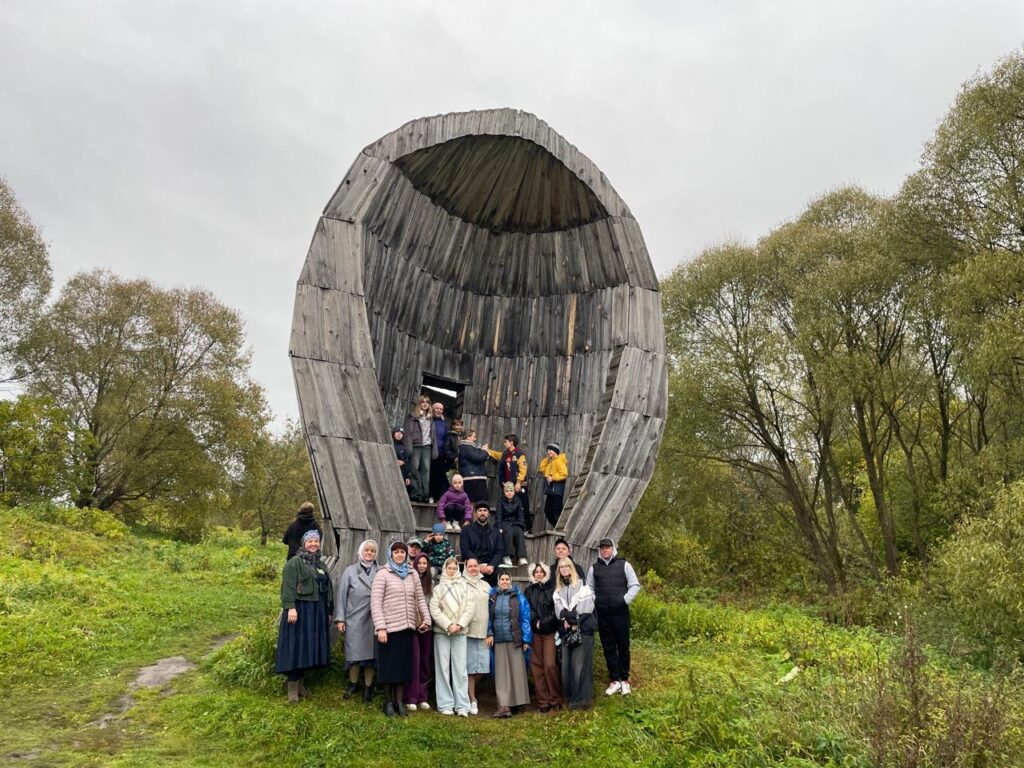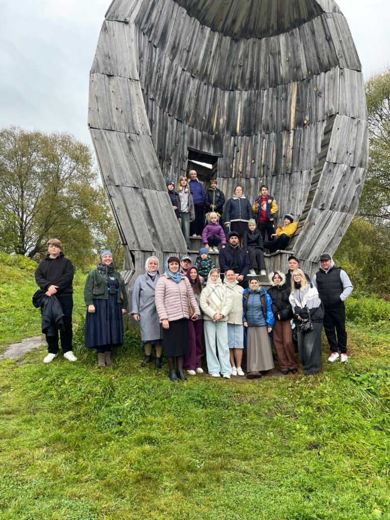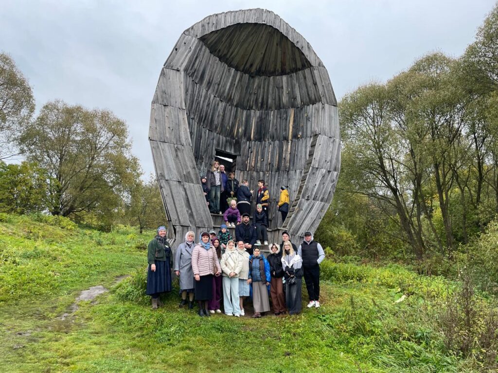 Наше путешествие началось с восстанавливающегося храма в честь Святой Живоначальной Троицы. По благословению настоятеля прихода протоиерея Вячеслава Сабурова, в храме был совершен молебен Святой Троице и свт. Николаю Чудотворцу. Погода нас встретила дождливым настроением, но сразу после молебна дождик прекратился, и мы смогли посетить арт-парк «Никола-Ленивец». По храму и арт-объектам парка провела очень увлекательную экскурсию сотрудник парка и директор Звизжевской библиотеки Кремень-Косякова Юлия. Экскурсовод рассказала об истории храма, этапах его восстановления, завершенных на данный момент. Образовании арт-парка, его художниках, поведала историю зарождения идей, вдохновении и воплощения арт-объектов.