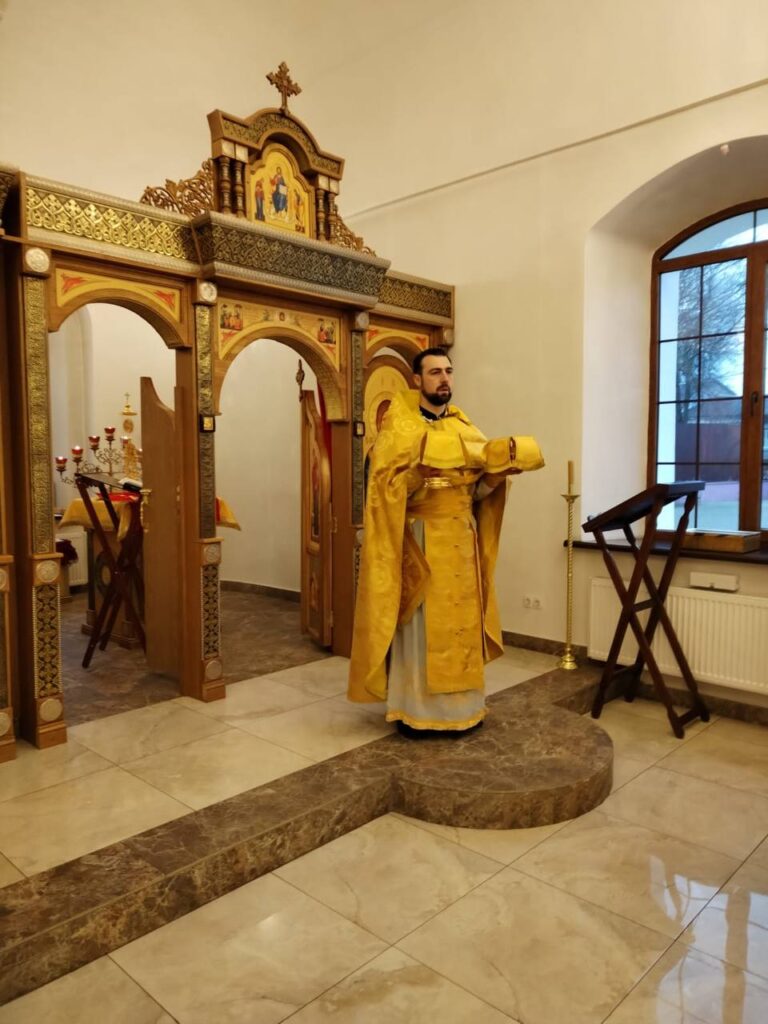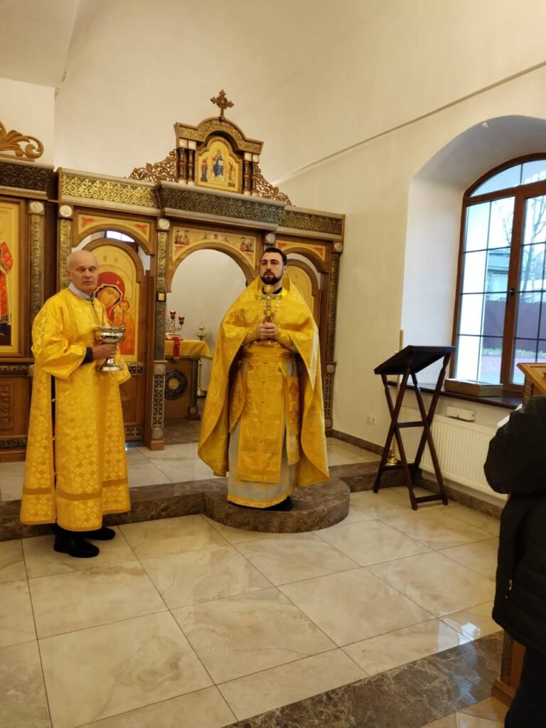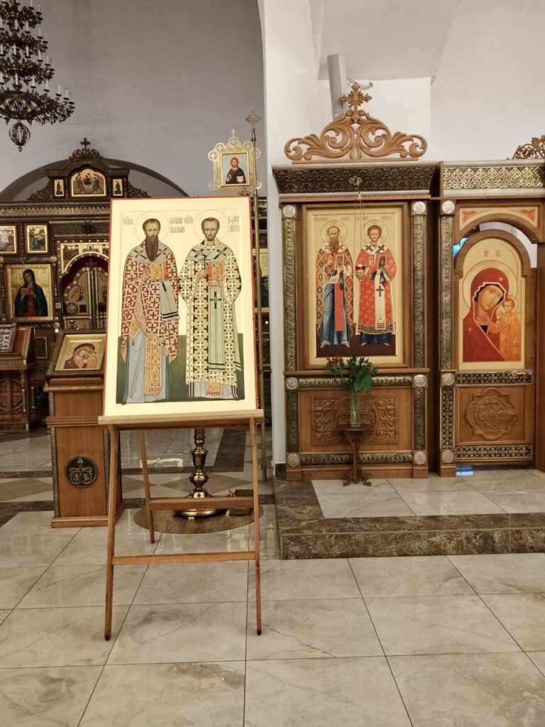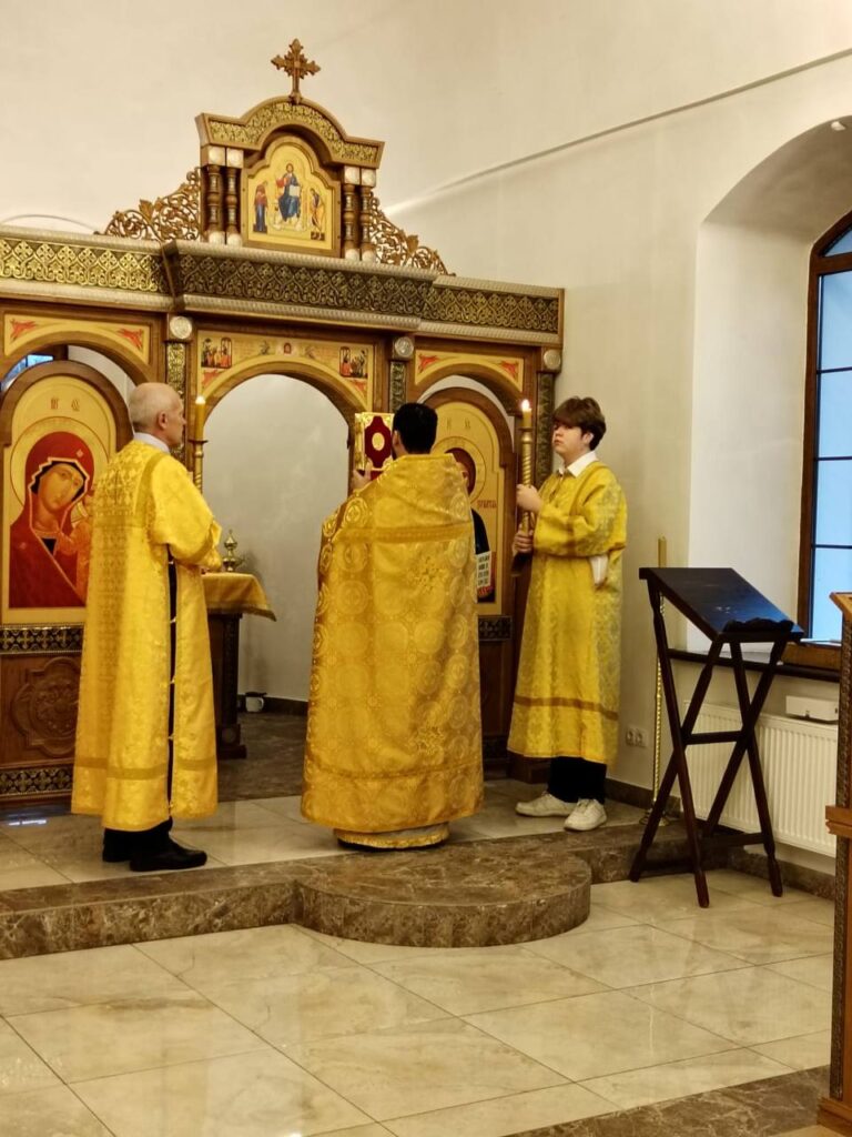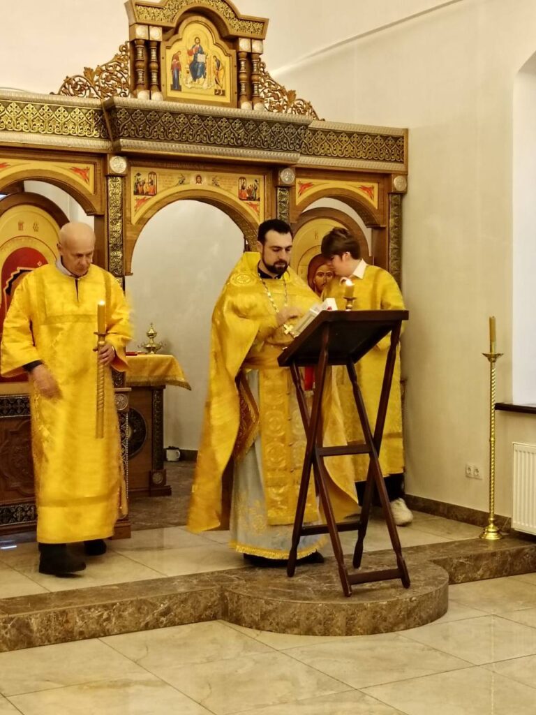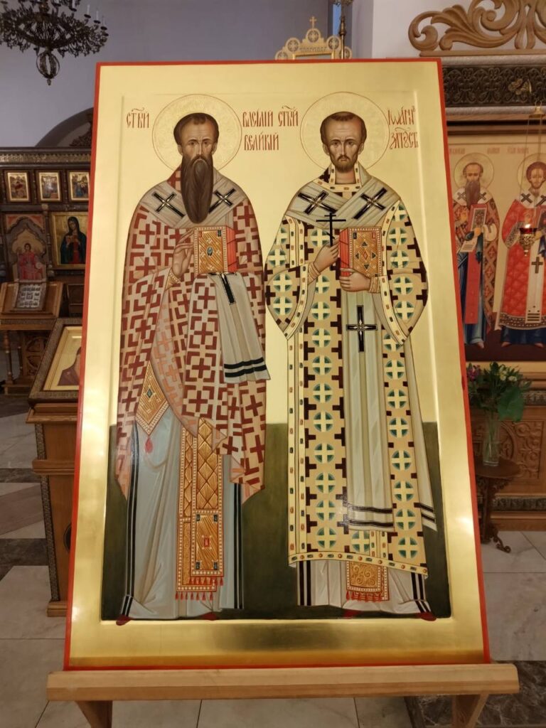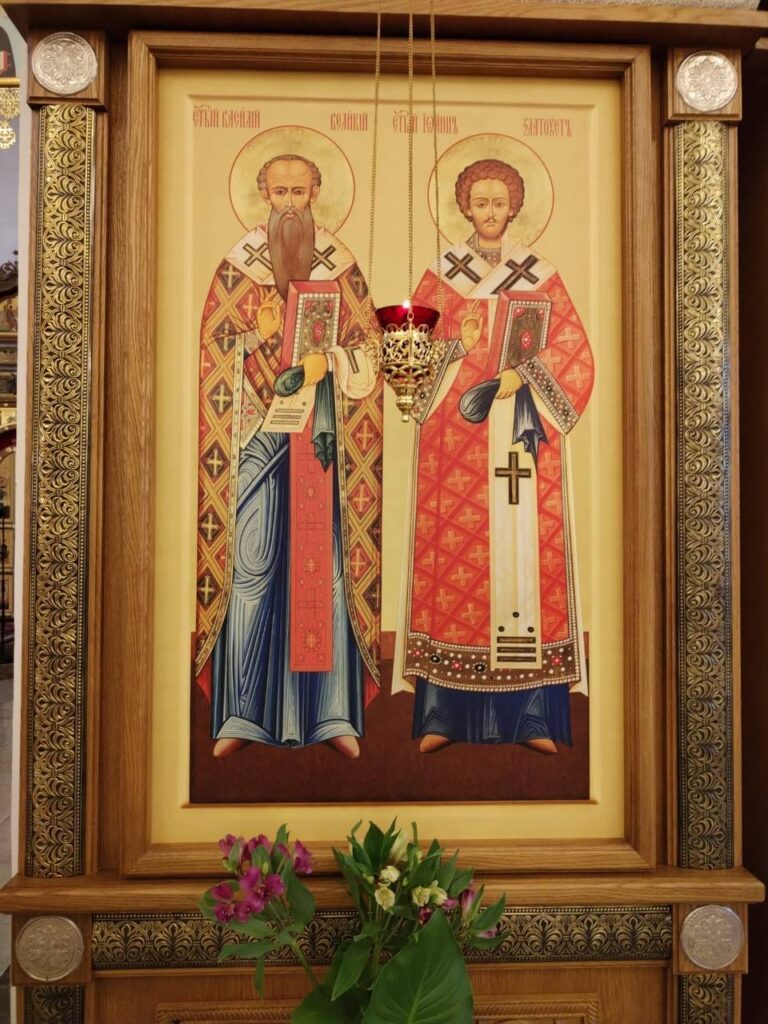 26 ноября 2025 — день памяти святителя Иоанна Златоустого, архиепископа Константинопольского. Для нашего храма — это престольный праздник. Малый придел освящён в честь Иоанна Златоустого. Поэтому само богослужение проходило в этом приделе. Придел был малый, но сама служба была очень насыщенной. После Божественной литургии отец Ярослав совершил чин освящения воды и освятил новую икону нашего храма с изображением двух святителей Иоанна Златоустого и Василия Великого для иконостаса этого придела. На проповеди батюшка поздравил всех присутствующих с праздником и выразил большую благодарность всем, кто оказал посильную помощь в написании иконы.