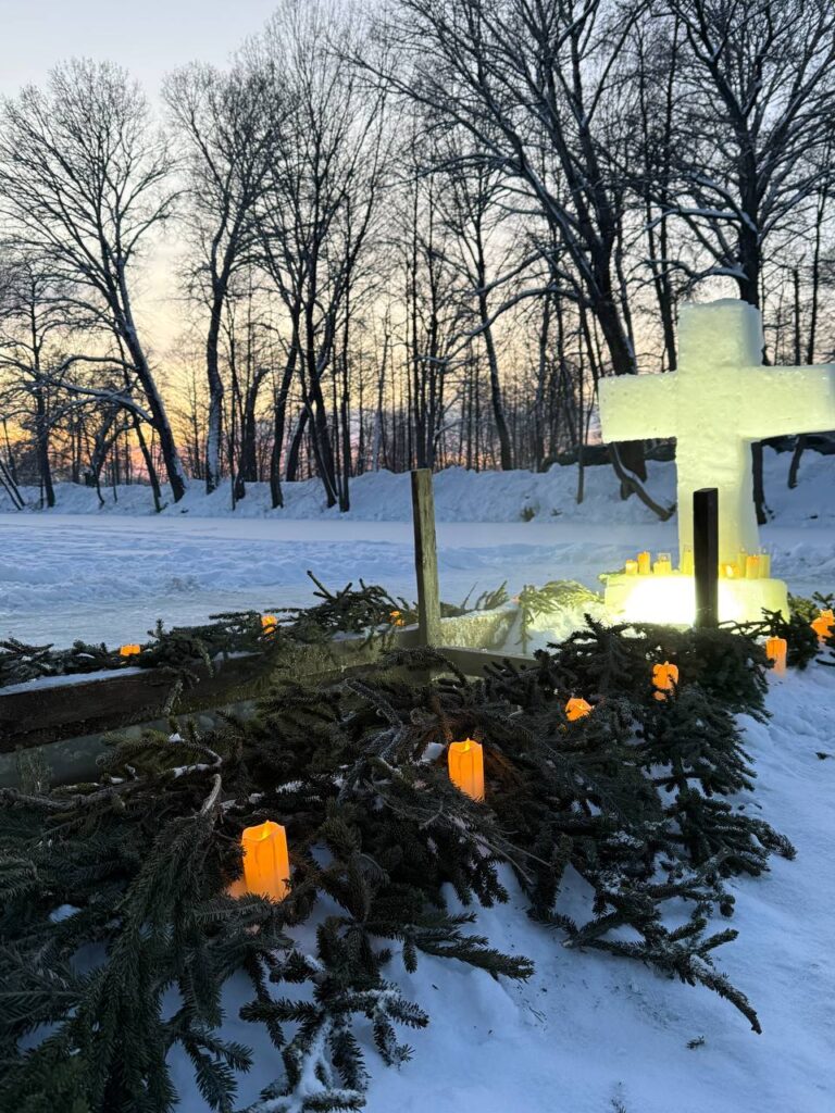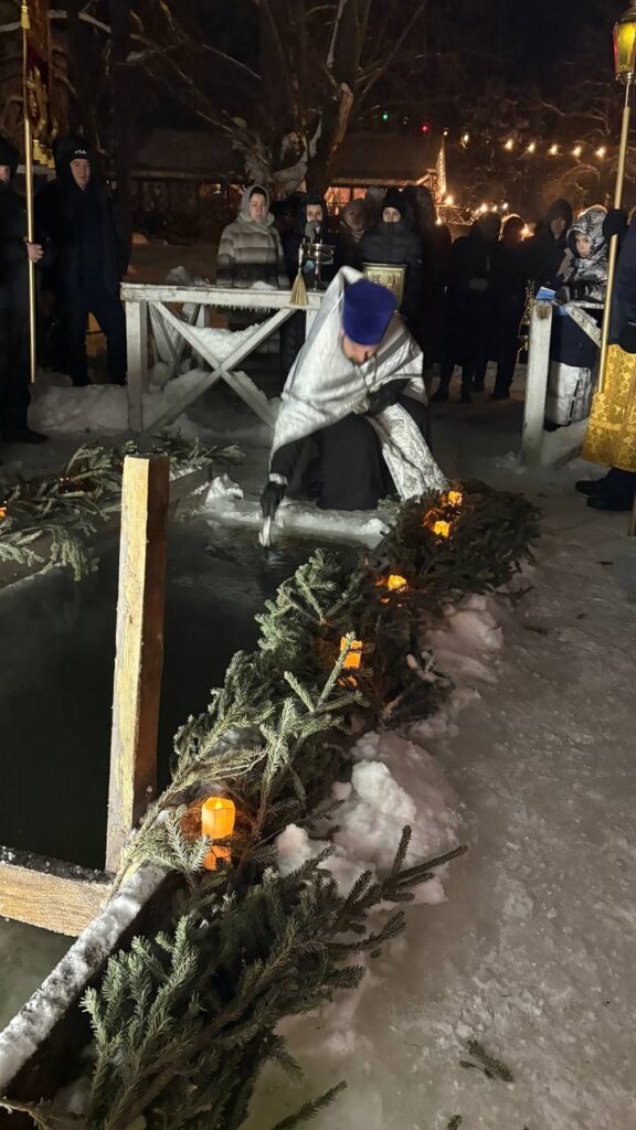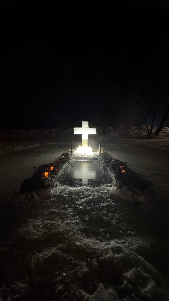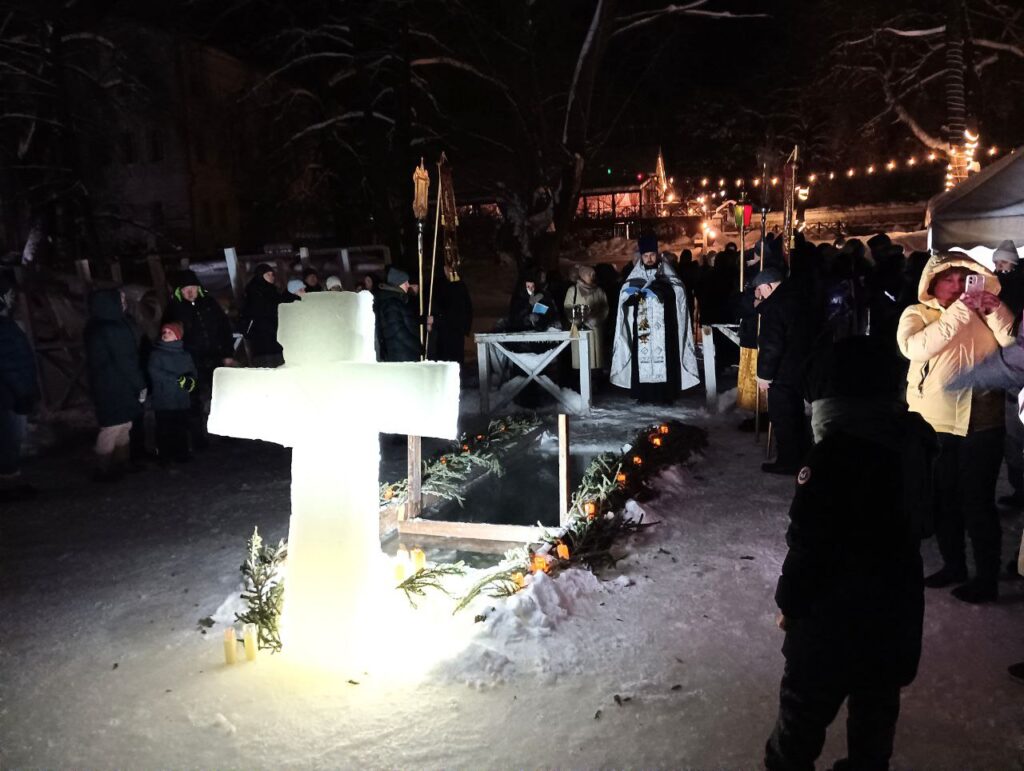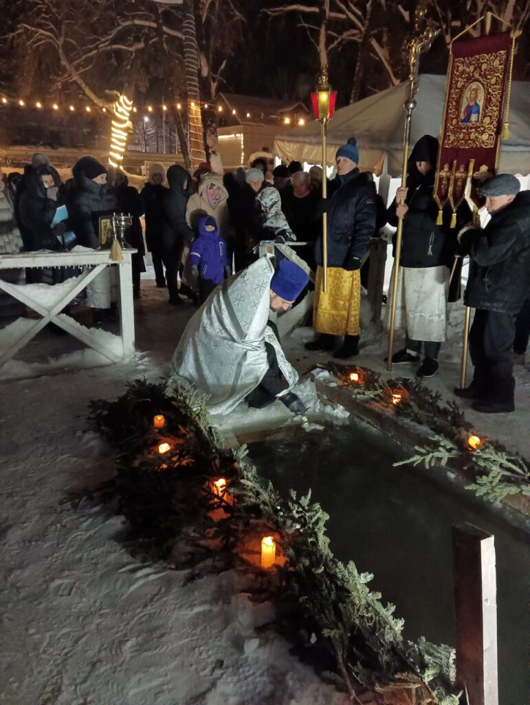 После прочтения 1-го часа, который освящает молитвой день наступающий, был совершен Крестный ход к реке Суходрев для освящения Иордани. Самые смелые прихожане, не боясь снега и холода отправились вместе с отцом Ярославом. Душа радуется то того, что мы идём по пути, который указан Самим Богом. Мы шли, возвещая о нашей вере, о Царствии Небесном, показывая Господу – мы готовы идти за Ним. Весь Крестный ход сопровождался пением нашего хора и молящихся. На реке уже была подготовлена иордань, рядом с которой возвышался полупрозрачный сверкающий ледяной крест и организована купель для желающих окунуться в воду.