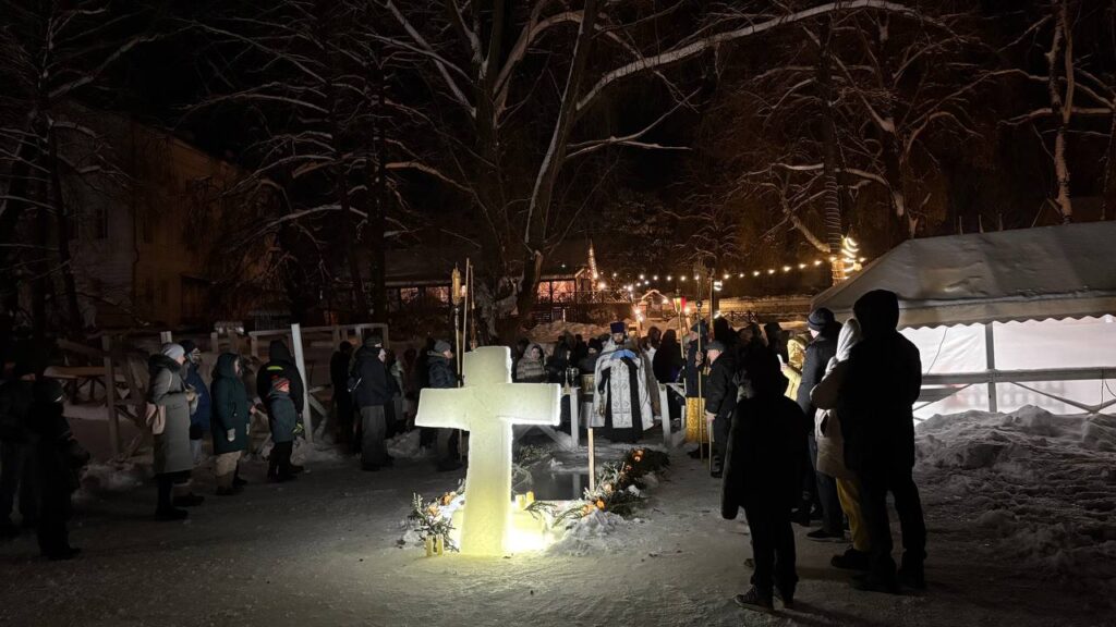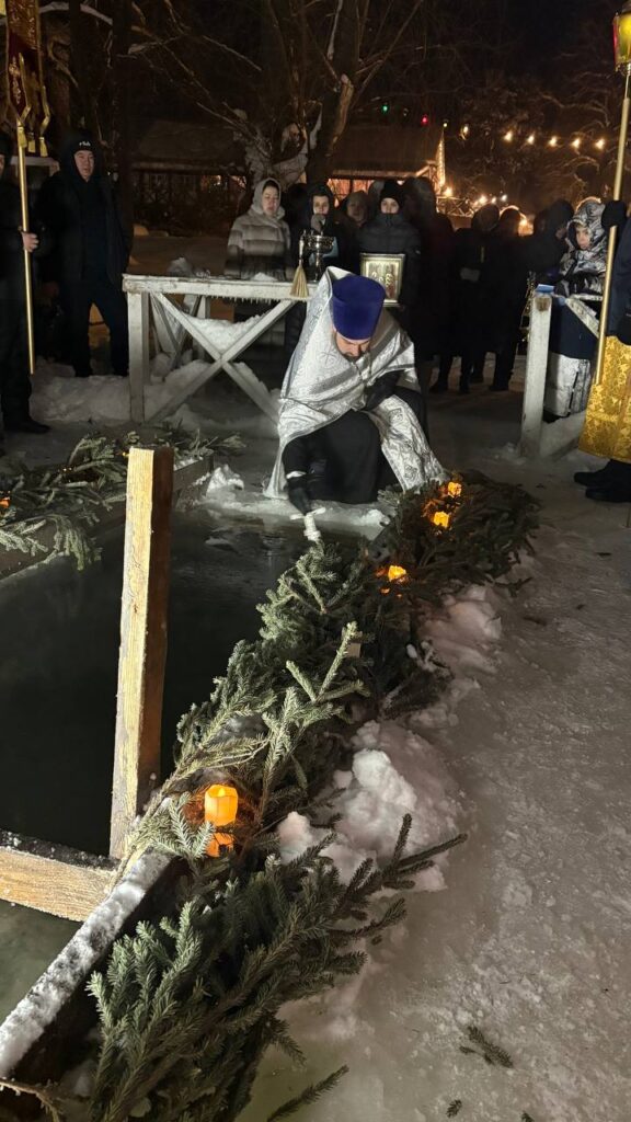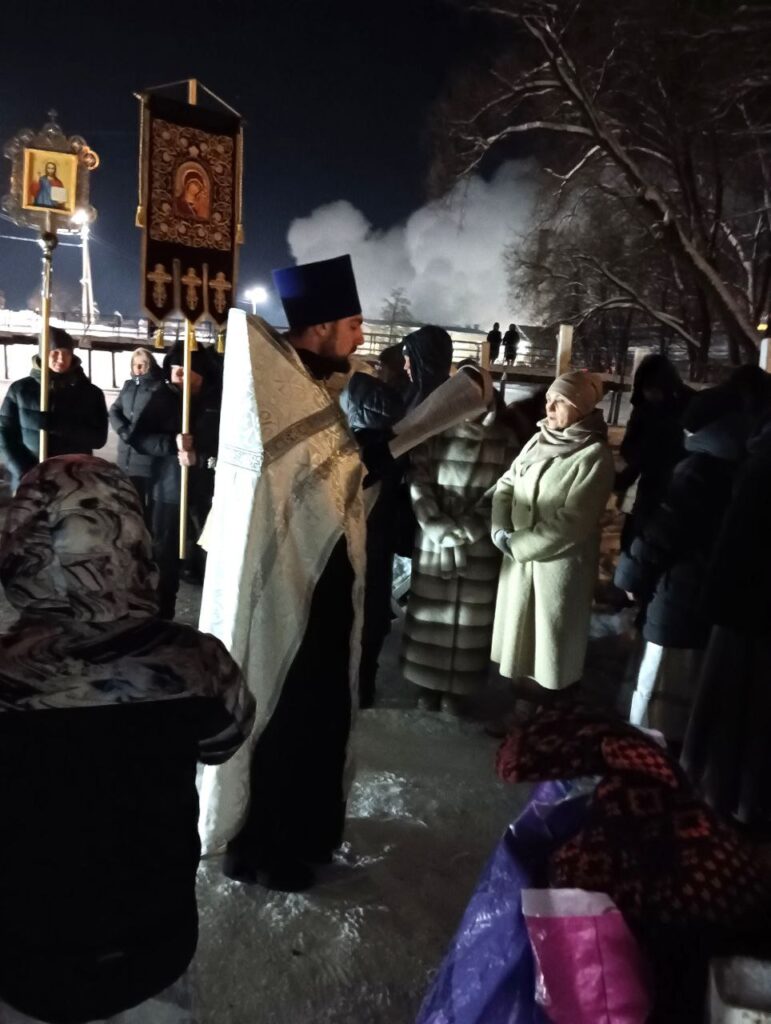 Всенощное бдение на праздник Крещенния состоит из великого повечерия с литией, утрени и 1-го часа. На великом повечерии отец Ярослав совершил литию с освящением хлеба, пшеницы, вина и елея. Затем хлеба унесли в алтарь и порезали на части, полив освященным вином. После литии началась Утреня, которая открывается Шестопсалмием. В это время в храме гасятся все свечи и в темноте каждый из предстоящих Богу людей вслушивается в покаянные слова псалмов, думает о своей жизни, за которую отвечать перед Богом. Окончилась Утреня чтением Евангелия, помазанием прихожан освященным елеем и раздачей освященного хлеба.