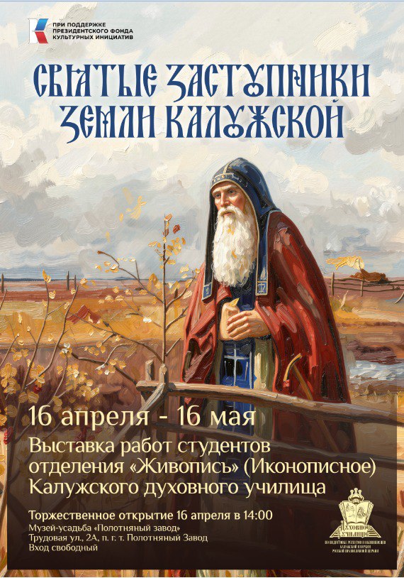 С 16 апреля по 16 мая в музее-усадьбе «Полотняный завод» пройдет выставка «Святые заступники Земли Калужской» одноименного проекта Духовного училища по подготовке регентов и иконописцев, получившего поддержку Президентского фонда культурных инициатив.